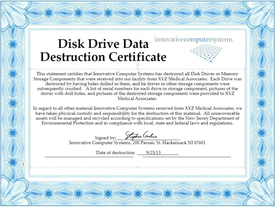 Hard Drive Destruction Certificate Template, Pricing models are relatively more complicated based on the amount and kinds of consumers, service levels, training requirements and child on. Thus, you’re best advised to contact their spouses. Quite often, particularly financial and other specialized information has to be simplified so it shows up as a transparent picture. Printer. Even though the use of digital contracts, documents and digital signatures will create your workplace, you will still have to get a printer, because some clients will decide to have their contracts.